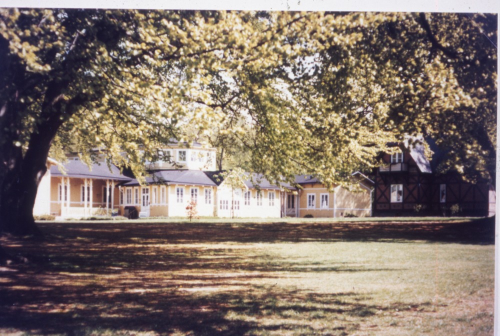 Bilden föreställer ett parkområde. I förgrunden gräsmatta och träd. I bakgrunden gul envåningsbyggnad med torn, samt del av korsvirkeshus.
