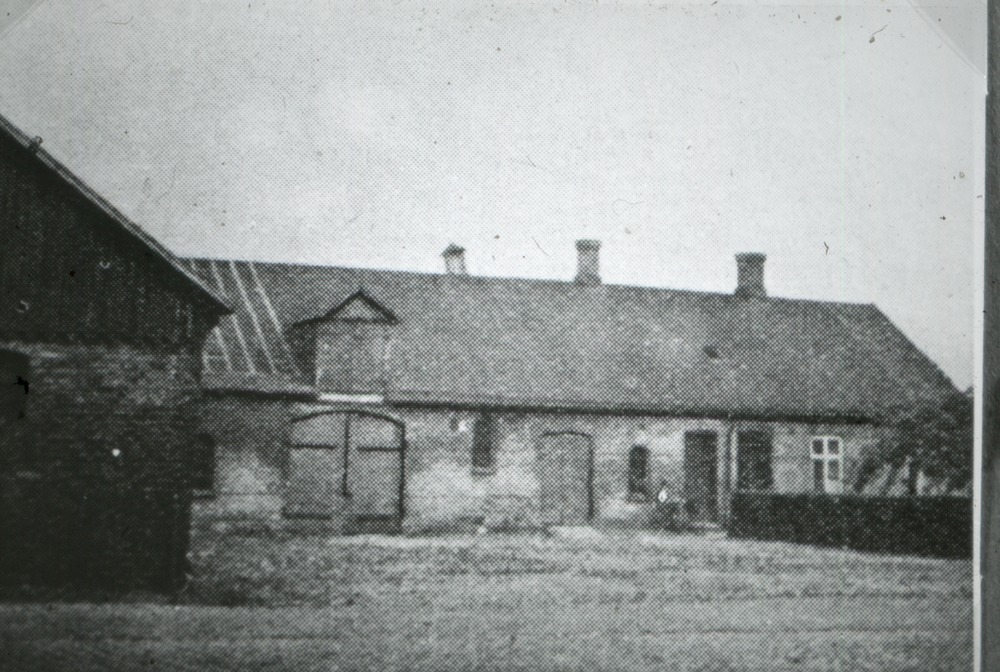 Bilden föreställer del av ladugårdsbyggnad i vinkel. Framför byggnaden en gårdsplan.