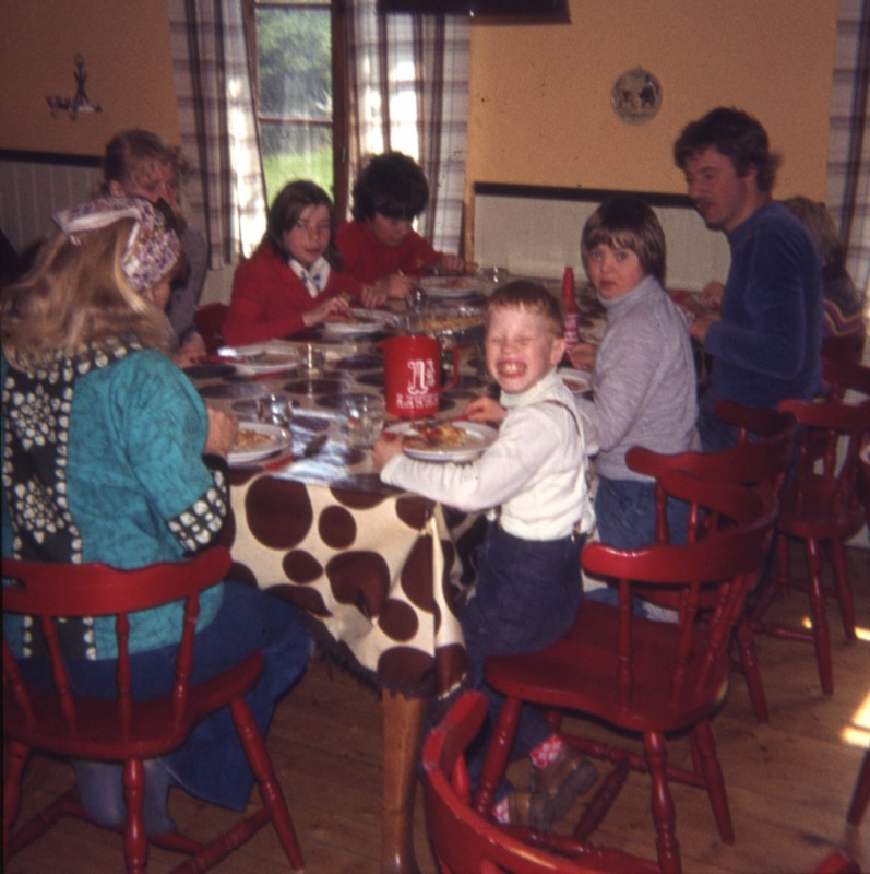 Bilden föreställer en matsal med ett långt bord med vaxduk. Vid bordet sitter barn och lärare och äter på tallrikar med bestick och glas. I bakgrunden fönster.