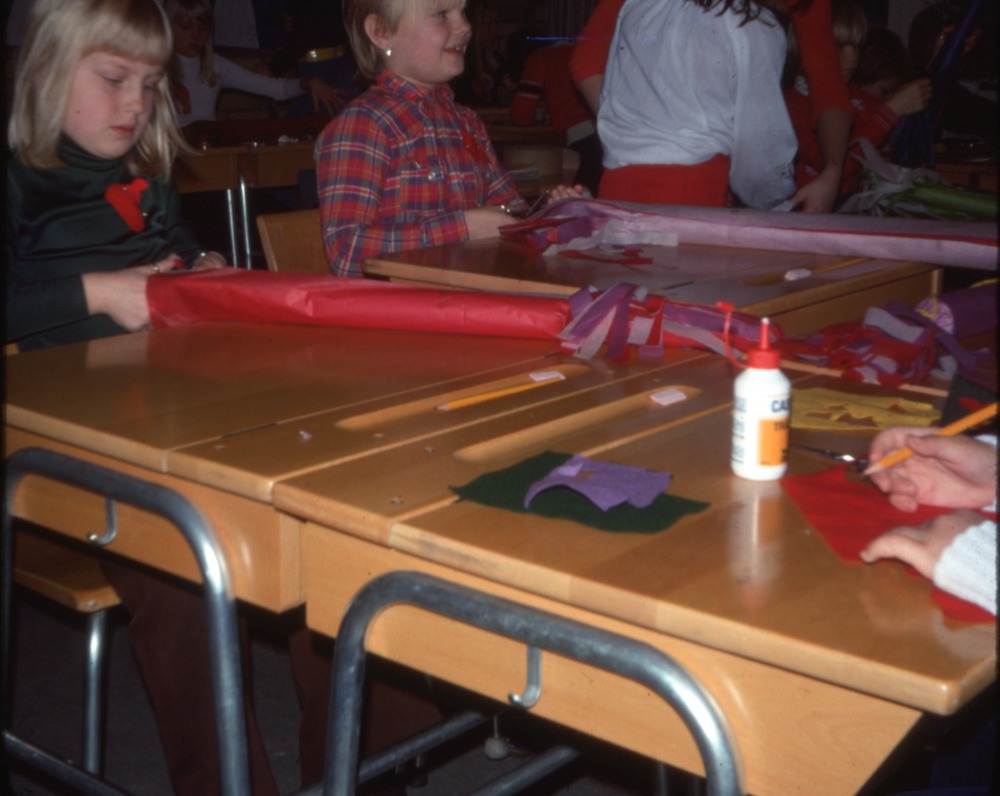 Bilden föreställer skolbänkar där det sitter barn som klipper och klistrar, julpyssel(?).