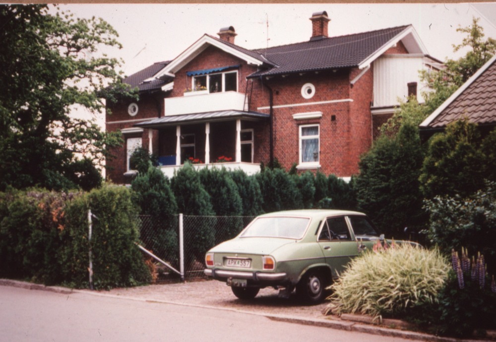 Bilden föreställer en tvåvåningsvilla. Framför den en häck och ett träd. Till höger garageuppfart med en bil. I förgrunden gatstump.