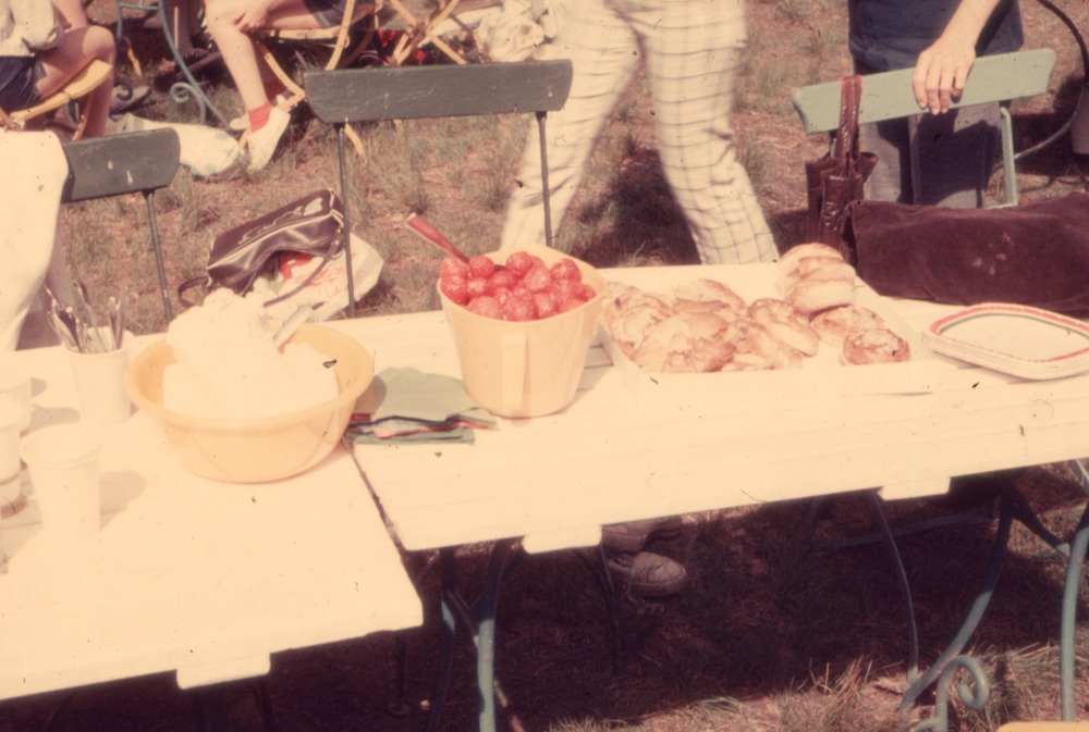 Bilden föreställer bord och stolar i en park. På borden står det kanelbullar, jordgubbar i bunke och glass i bunke samt papperstallrikar och skedar i en mugg. I bakgrunden skymtar man lite ben sittande och stående.