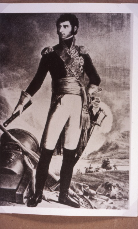 Bilden föreställer ett mansporträtt, formatet är helfigur. Mannen har uniform och värja. Landskap i bakgrunden. Troligen Jean Baptiste Bernadotte.
