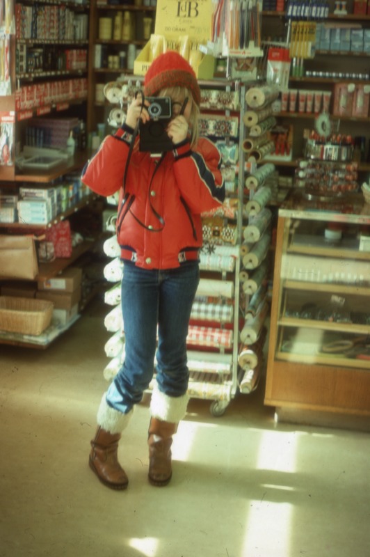 Bilden föreställer en disk i en butik, samt hyllor med varor. Där står en flicka som fotograferar den som fotograferar.