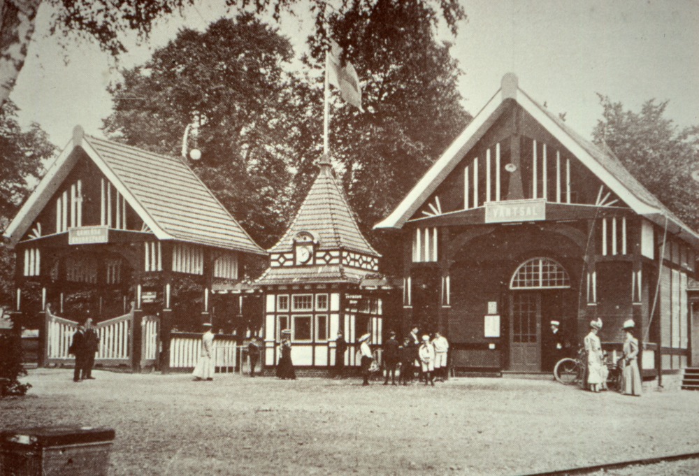 Bilden föreställer två enochenhalvplans byggnader med branta tak och mellan dem en kiosklikande byggnad med pyramid format tak. På en byggnad en skylt med texten Ramlösa xxxx och på andra byggnaden en skylt väntsal. I bakgrunden träd. Framför husen öppen yta där det rör sig människor. Framför vänstra huset ett staket och en grind. Ramlösa hälsobrunn entrén.