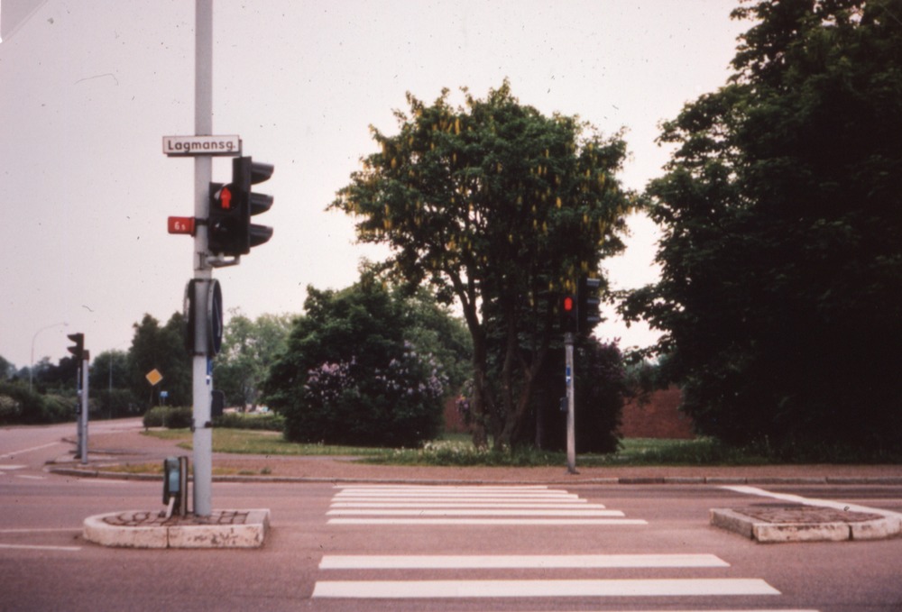 Bilden föreställer en gatulkorsning med trafikljus och övergångsställe. I bakgrunden park. På en lyktstolpe sitter en skylt "Lagmansg"