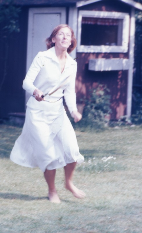 Bilden föreställer en kvinna barfota med ett badmintonrack i en trädgård. Bilden tillhör troligen Examenskaffe hos Brita Lundin 1979.