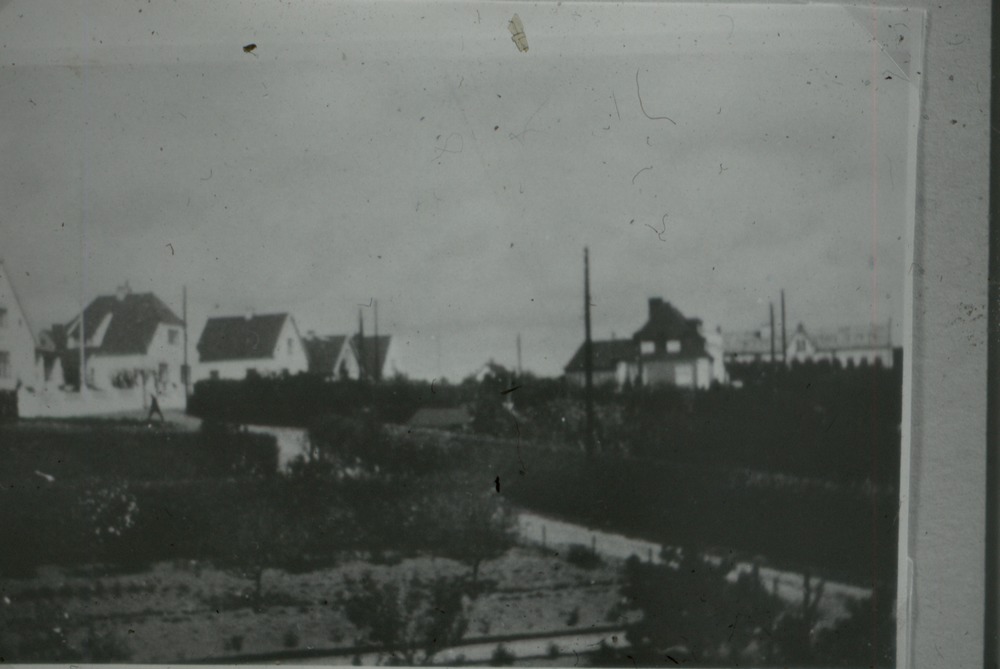 Bilden föreställer i förgrunden åkermark, trädgård, med buskar. I bakgrunden villor. Genom bilden löper en väg.