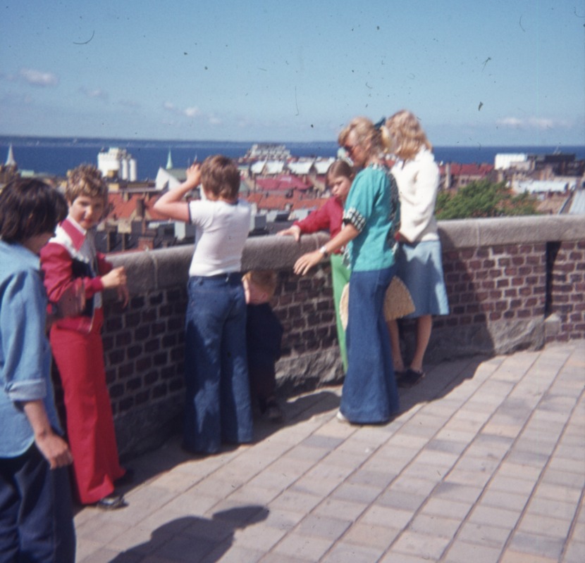 Bilden föreställer fyra barn och två lärare som står överst på terrasstrapporna och tittar ut över staden.