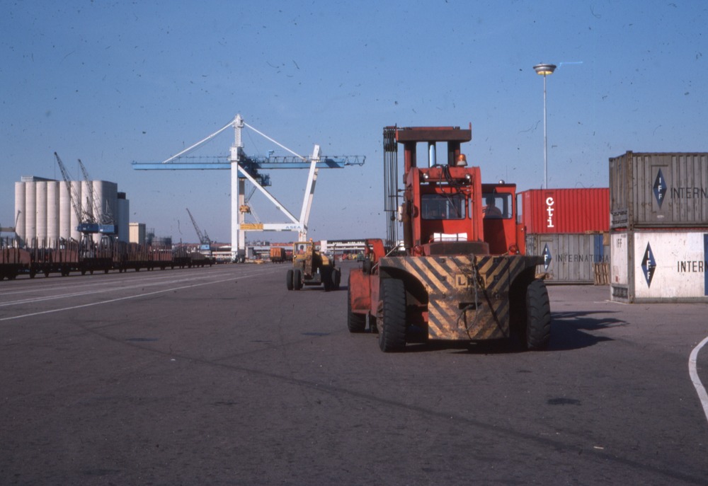 Bilden föreställer öppen yta med en truck och ett annat lastfordon. Till höger containrar. I bakgrunden silobyggnader och lyftkran samt järnvägslastvagnar.