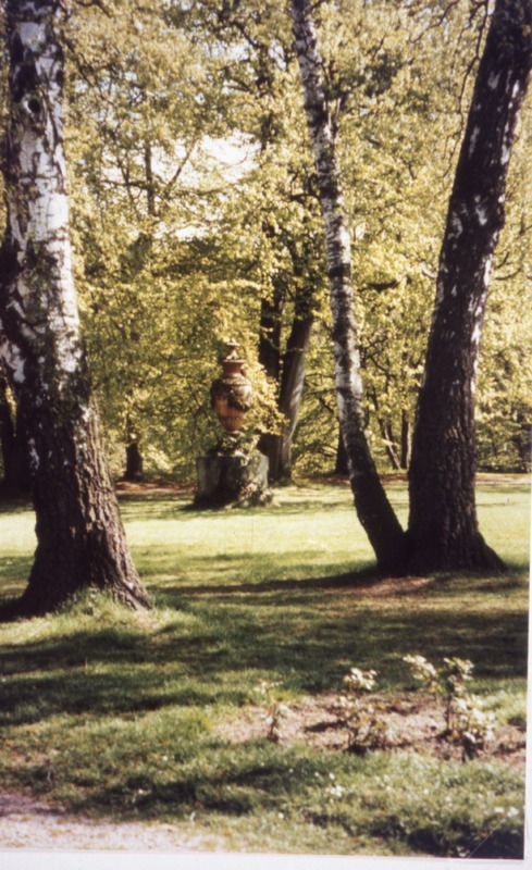 Bilden föreställer ett utsnitt av en park med gräsmatta och trädstammar, björkar.