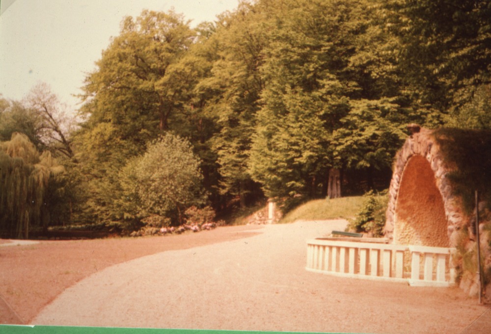 Bilden föreställer en stor öpen yta med gångbana och brun gräsmatta. I bakgrunden träd. Till höger murat valv över vattenkälla, alkaliska källan, med staket framför