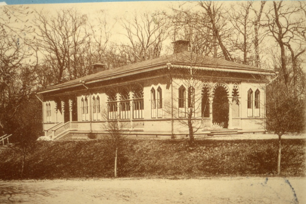 Bilden föreställer en enplansbyggnad, paviljong i en park. I bakgrunden träd. I förgrunden gångbana och gräsbevuxen slänt.