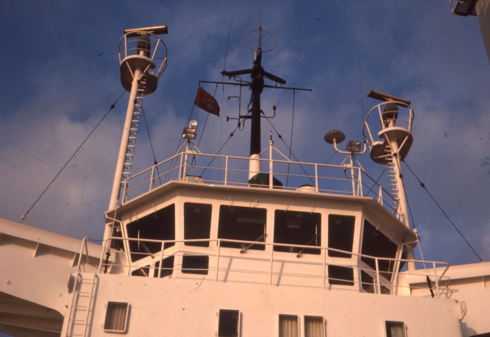 Bilden föreställer manöverutrymme på fartyg utifrån, grodperspektiv. Där är också flera master.