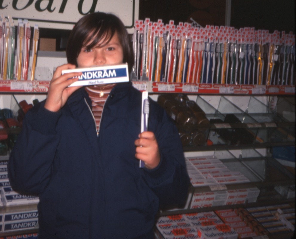 Bilden föreställer staplade varor i en butik på en färja (?). Ett barn står med tandkräm "konsums blåvita" och tandborste. Bakom barnet mer tandkräm och tandborstar. På en lapp i asken står det LB-färjan, Sinisia och Zavisa.