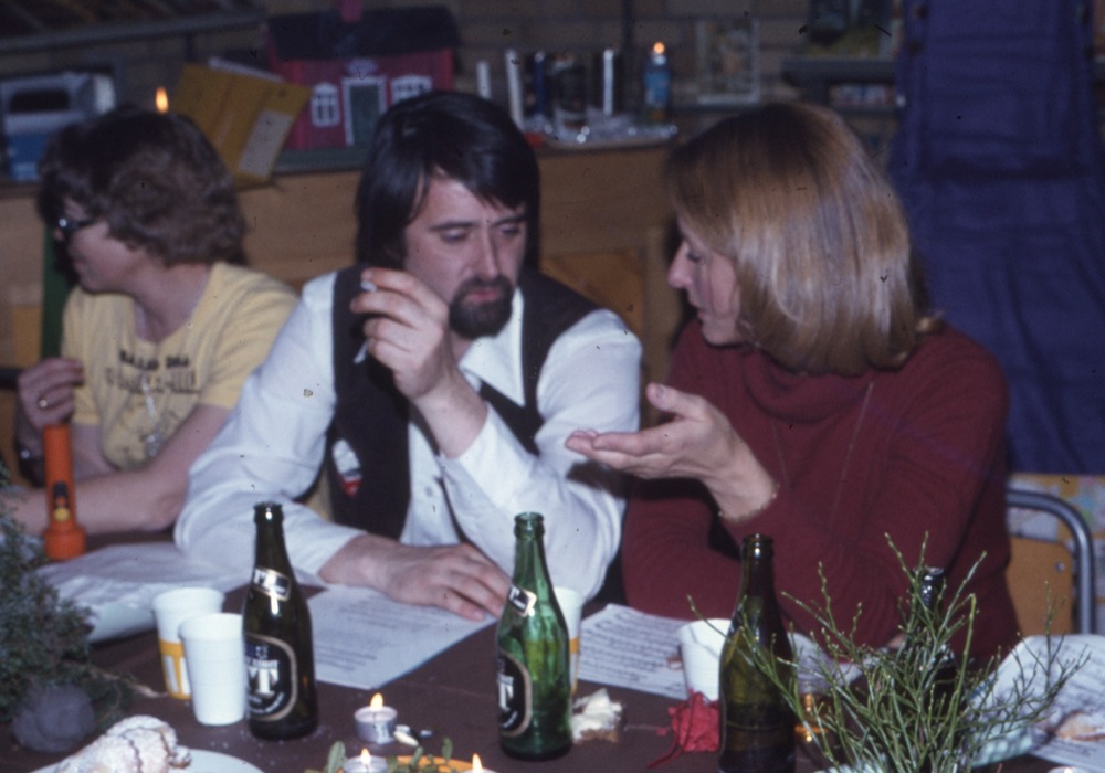 Bilden föreställer tre människor som sitter vid ett långbord som är dukat med muggar och flaskor mewd dryck. Alla har också ett texthäfte framför sig. Där är också juldekorationer. En man röker. I förteckningen står det avskedskaffe, FEST.