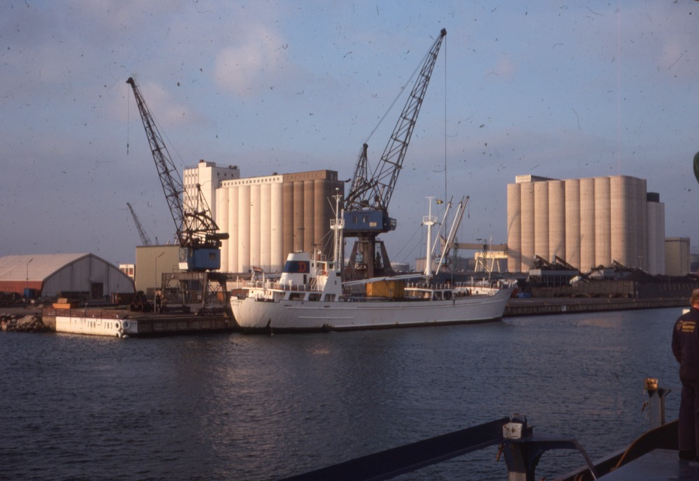 Bilden föreställer en hamn i förgrunden kaj. På andra sidan i hamnen ligger en båt och på land står lyftkranar och silobyggnader.