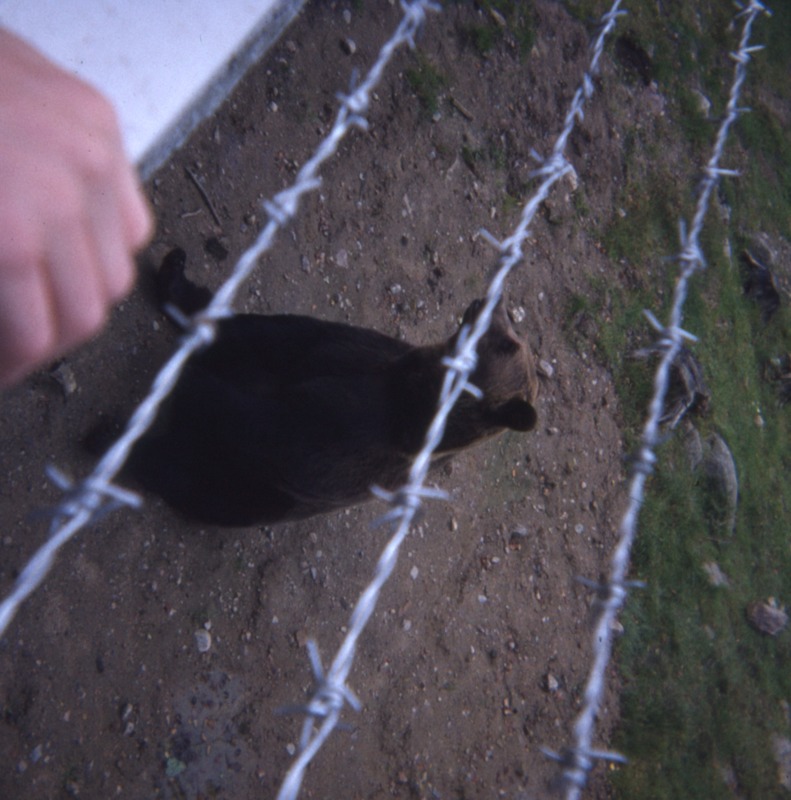 Bilden föreställer fågelperspektiv på en björn i en djurpark. I förgrunden taggtråd.