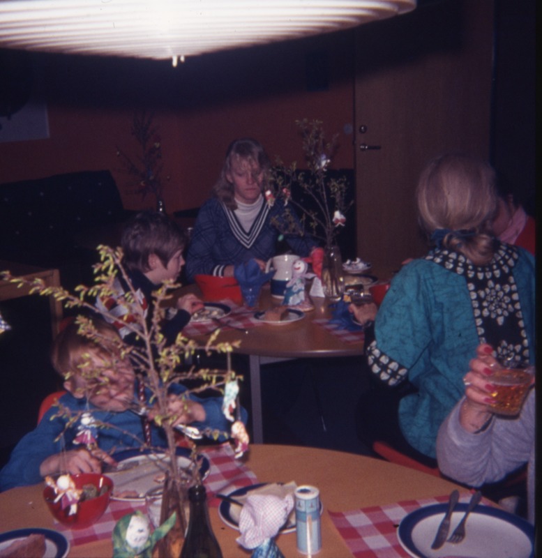 Bilden föreställer ett rum med bord och stolar där det sitter barn och lärare och äter på tallrikar med bestick.