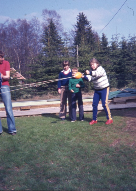 Bilden föreställer en gräsmatta där det står fyra barn som leker någon lek med en gul kon på snöre. Bakom dem trätrall på marken och sedan träd.