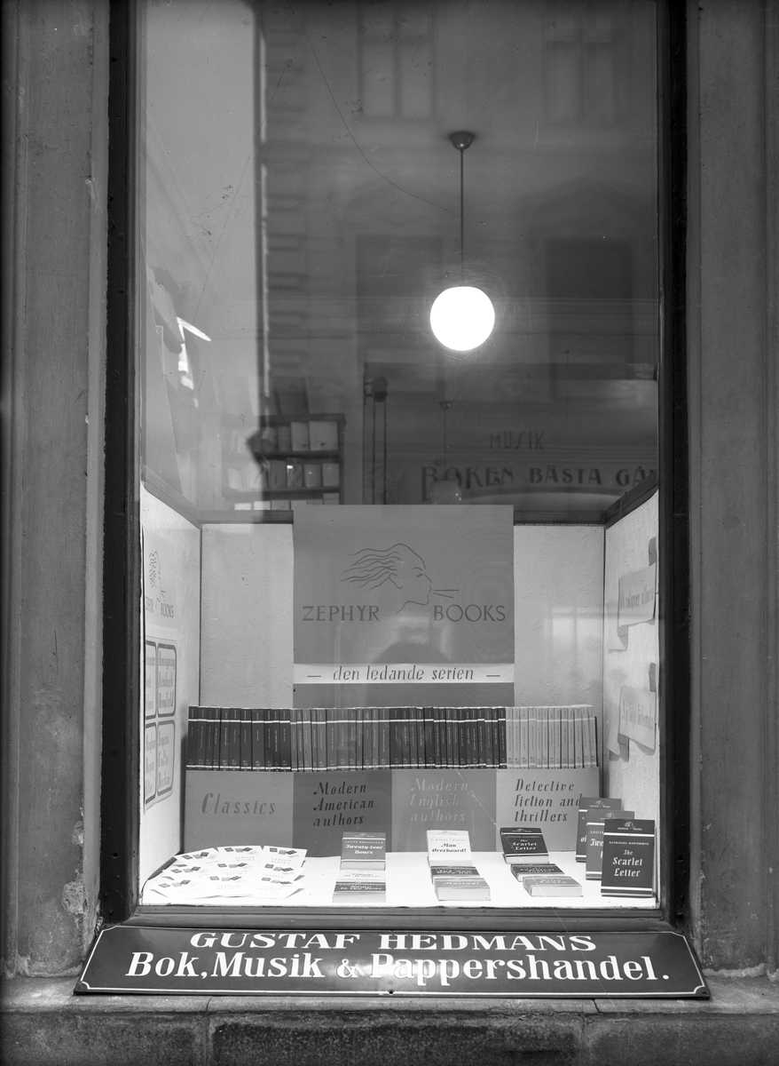Skyltfönster Zephyr-Books. 28 mars 1945. Hedmans Bokhandel.