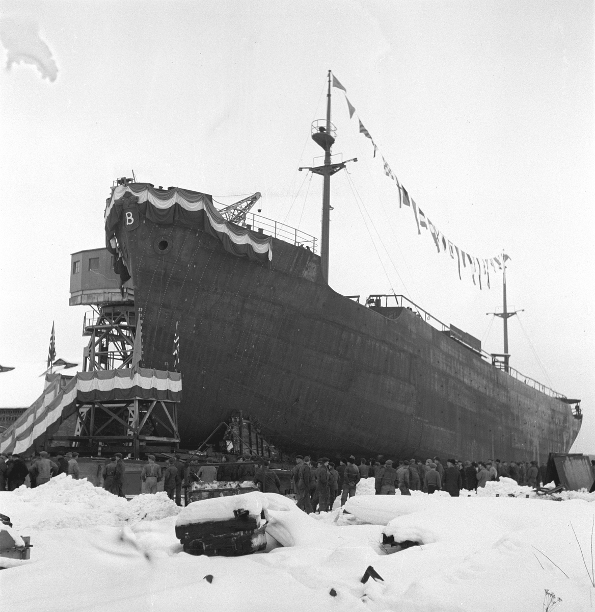 Gävle Varv från "Gezina Brövings" stapelavlöpning. 14 januari 1950.