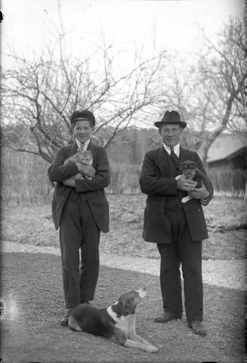 En man och en pojke med husdjur.