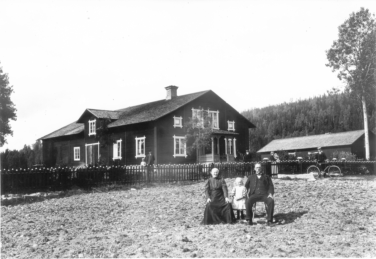 "Gammelnyströms" i Finnfara utanför Bollnäs. Bilden är tagen 1908 samma år som Sigrid Olsdotter dog. Flickan på bilden är barnbarnet Signe f 1904. Till höger maken Olof Nyström 1844-1928. Vid staketet Signes mamma Elin med sonen Olof f 1907. Vid cykeln Per Nyström 1880-1960.