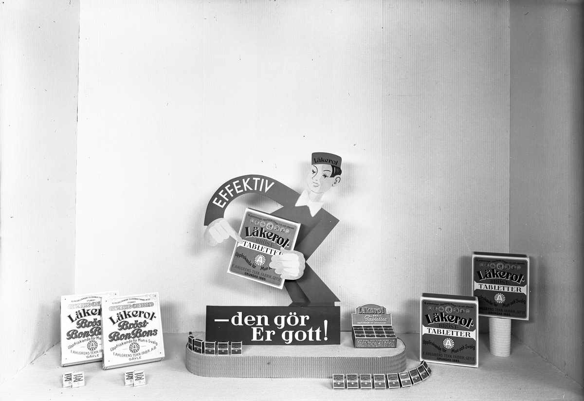 Reklam, Läkerolskylt till fönster. September 1945. Ahlgrens Tekniska Fabrik, Gävle.