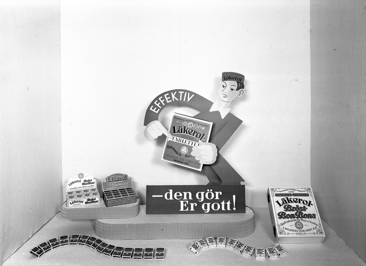 Reklam, Läkerolskylt till fönster. September 1945. Ahlgrens Tekniska Fabrik, Gävle.