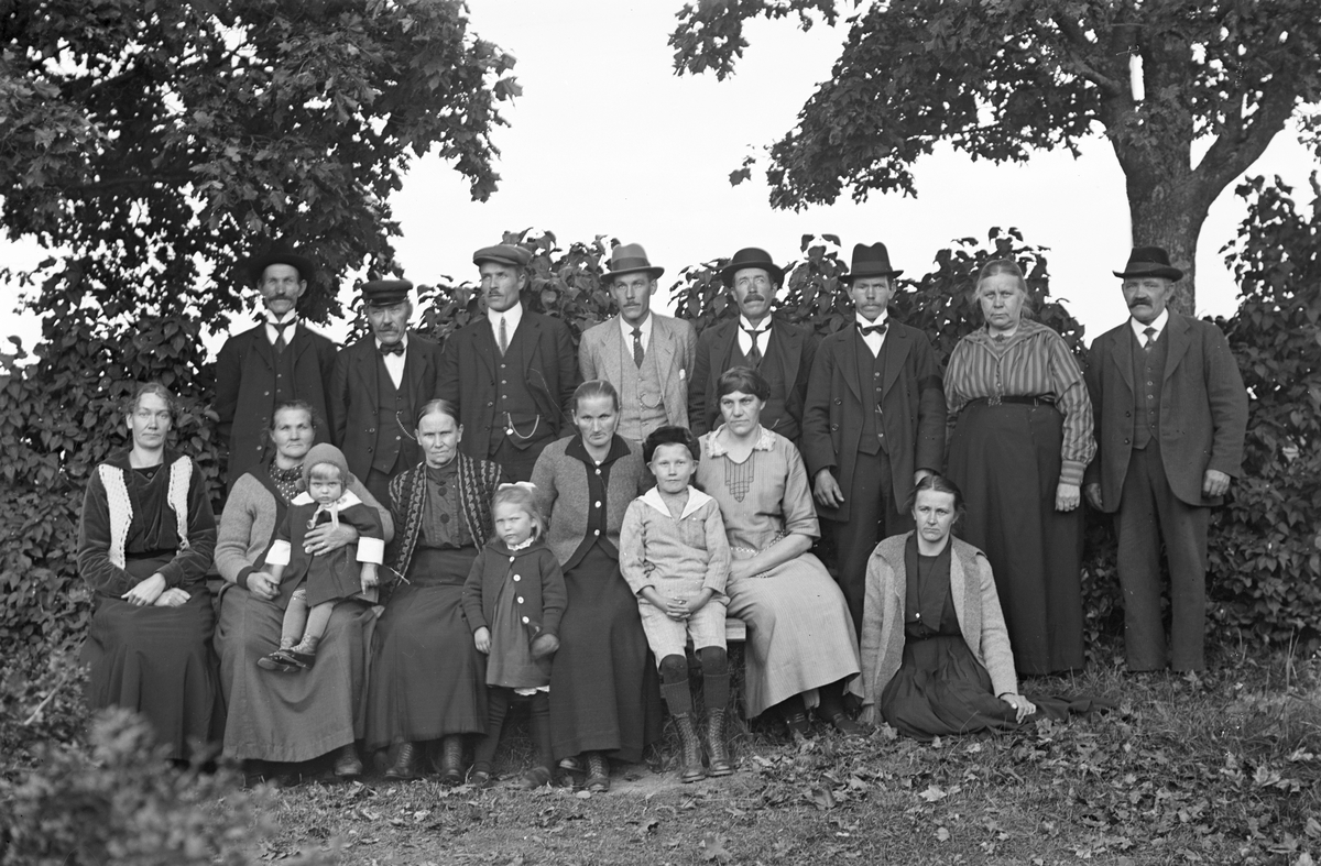 Sittande från vänster ?, Anna-Greta Ersdotter, Barbro Olsson, ?, ?, ?, ?, Jenny Olssson, Englina Olsson. Stående från vänster ?, Oskar Larsson, Albert Olsson, Otto Olsson, ?, ?, Ann Maria Larsson och Per Erik Eriksson (Josefs mor och far).