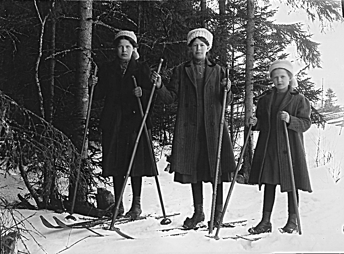 Från vänster: okänd flicka, Ester Lindberg och Elvira Lindberg på skidor.
