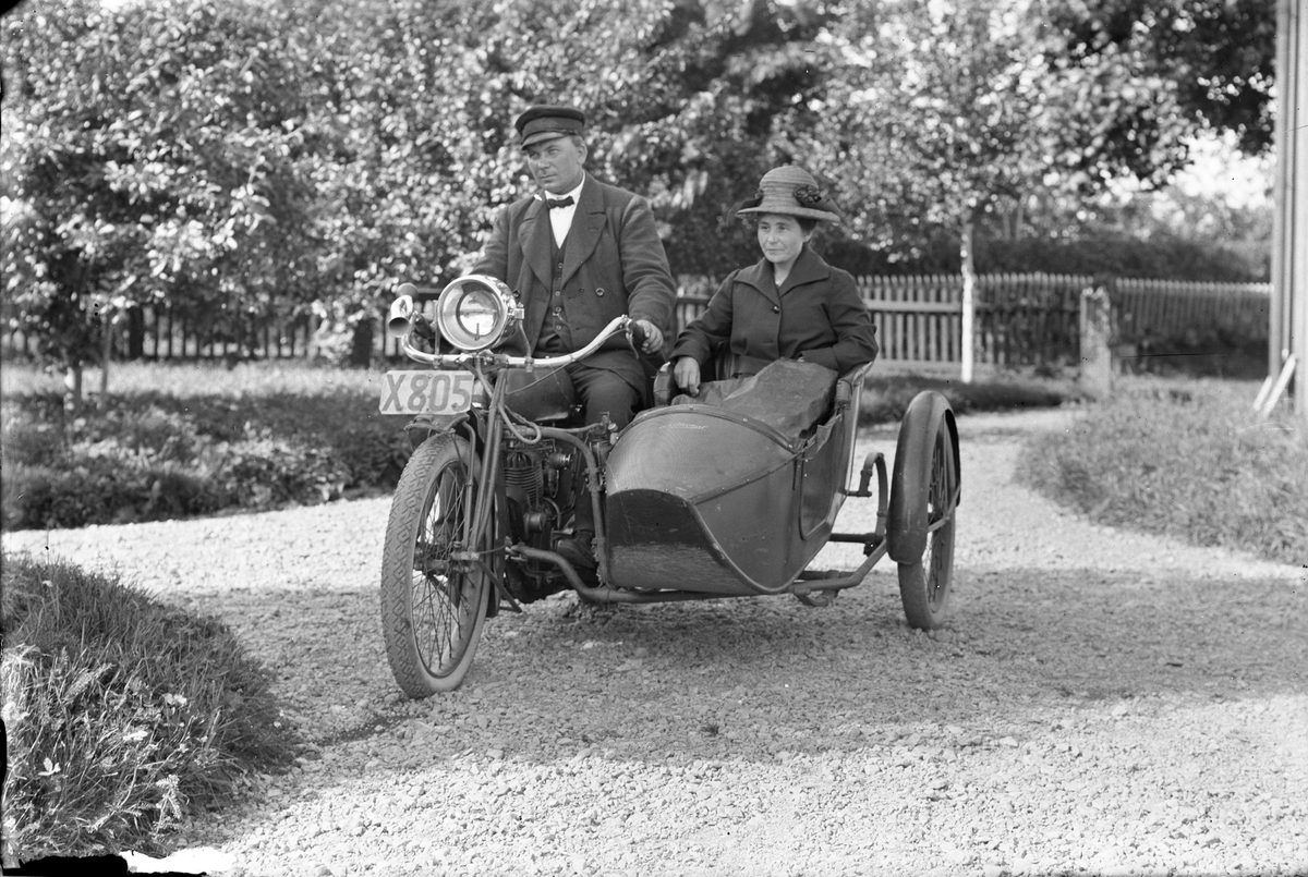Motorcykel med sidovagn. X805, Indian 7,5 hk 1922 ägd av Axel Petterson i Nyhyttan, Hästbo. På motorcykeln Axel Pettersson och Elin Pettersson.