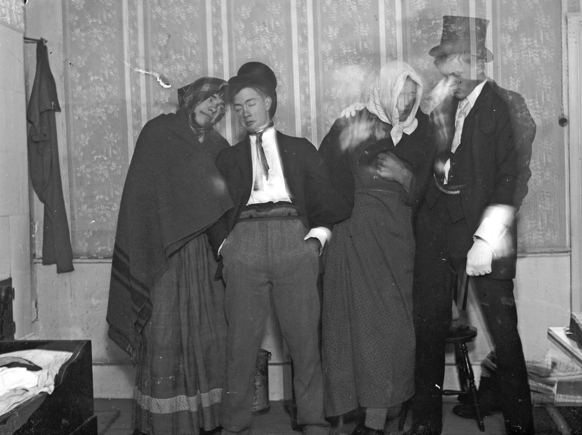 Klädda för maskerad är pojkarna i Åsmundshyttan. Från vänster Joel Eriksson, Arnold Jönsson, Axel Lindqvist och Joel Hansson.