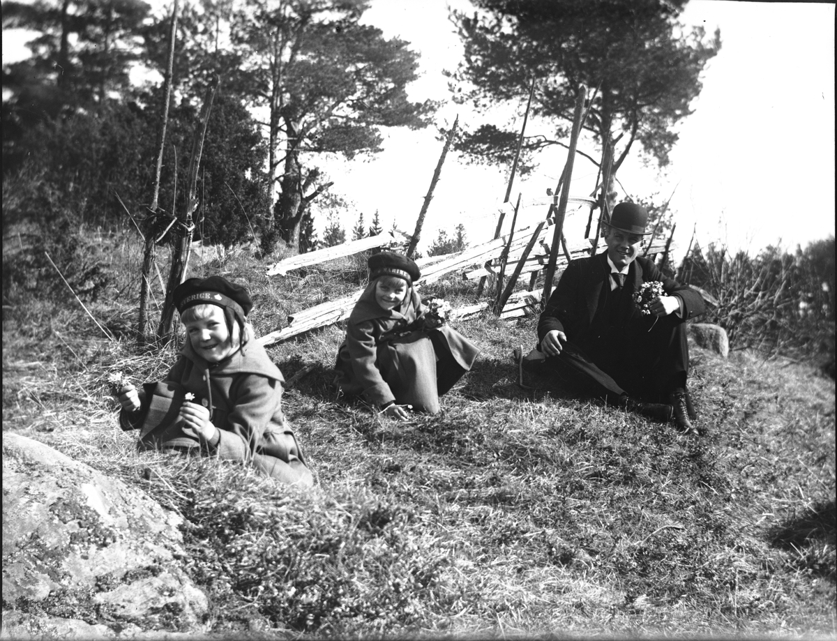 David Brundin på vårlig utflykt med sina två äldsta döttrar Karin och Ingrid, som plockar vitsippor.