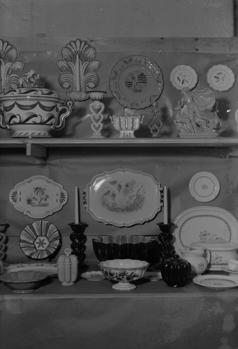 Utställda keramikföremål från Gefle Porslinsfabrik.