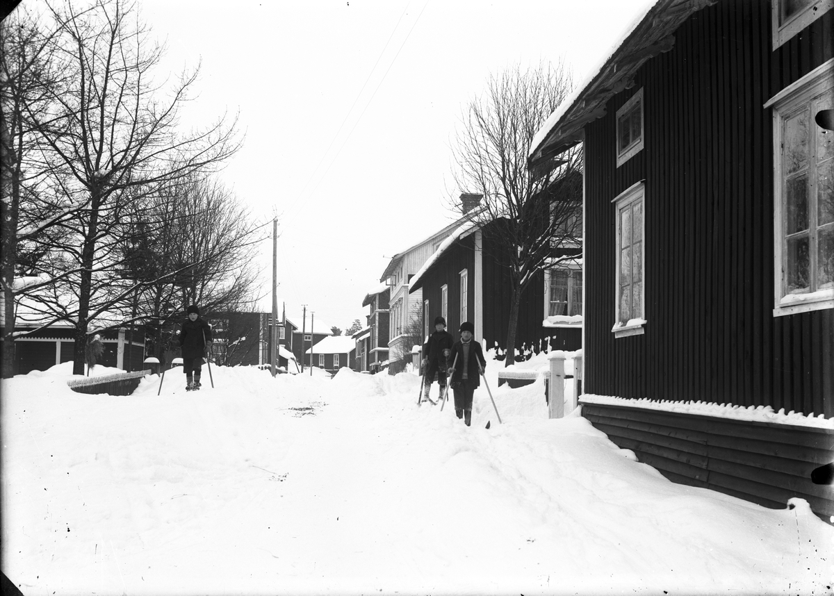 Skidåkande pojkar på Kvistholmsvägen, Kvistholmen, i Norrsundet.