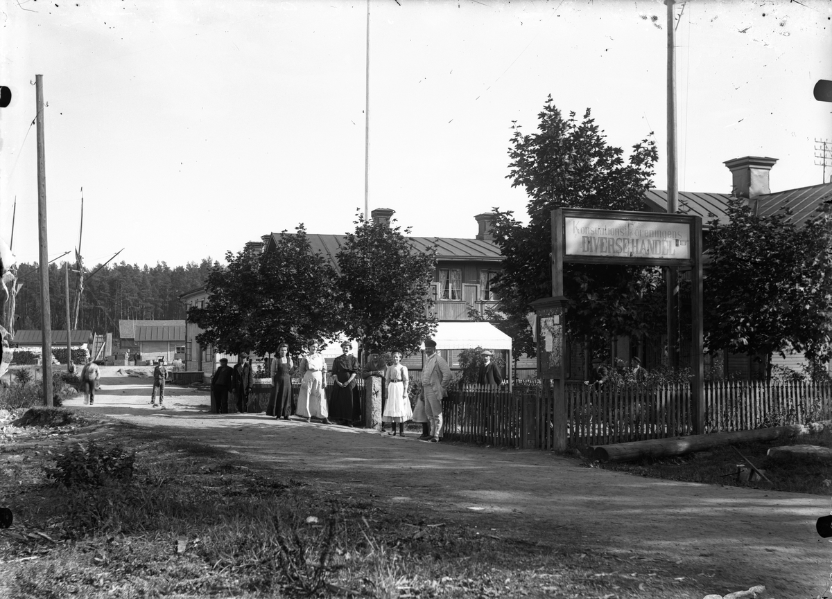 Konsumtionsföreningens Diversehandel, skylt. Gruppbild.