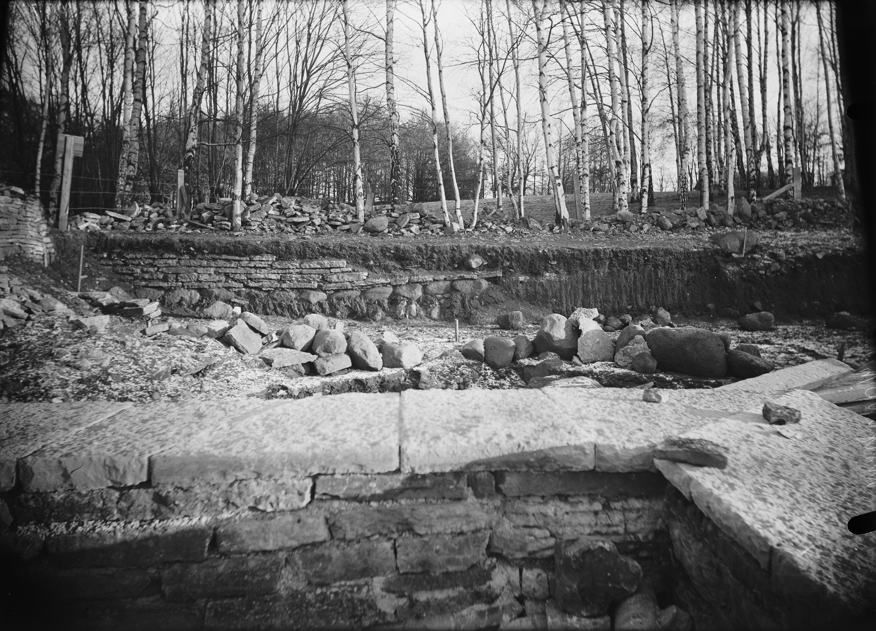 En del av muren och dess grund blottad. Till höger syns tydligt gränsen mellan de äldre och de yngre jordlagren. Från väster.
