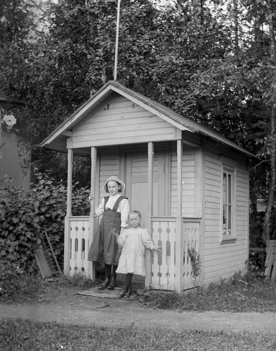 Två flickor vid lekstugan. Troligtvis i Gammelstilla, Torsåker.