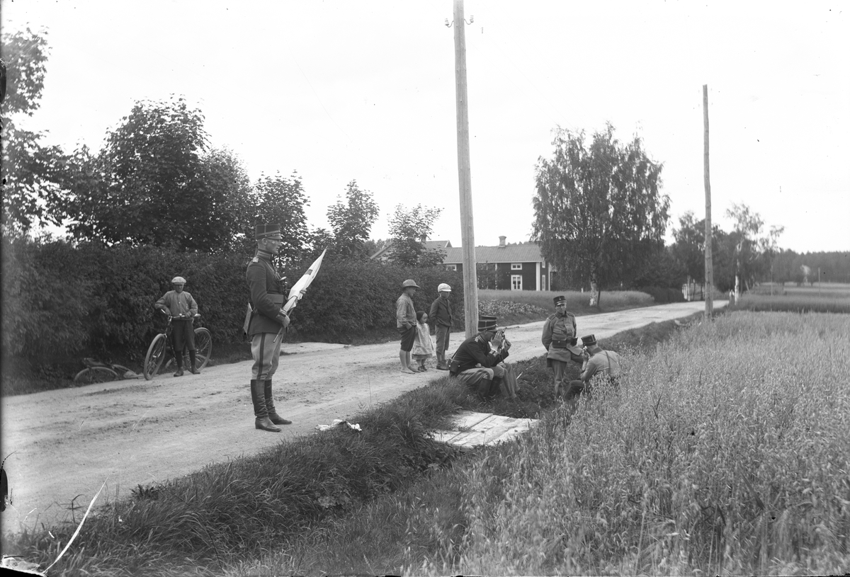 Militärer från Hälsinge regemente och barn vid ett landsvägsdike.