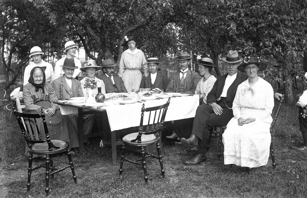 Åsmundshyttan 5:4, "Erik-Daniels". Stående från vänster Elsa Åsberg-Kling, Edit Åsberg-Norling, Olga Charlotta Åsberg f. 4 december 1888 d. 9 mars 1929. Sittande från vänster Karin Jansdotter f. 21 december 1847 d. 22 september 1925, Anders Olson-Åsberg f. 19 mars 1849 d. 12 augusti 1924, Anna Johansson f. 15 september 1888, Karl Johansson, Lars Gustav Åsberg f. 28 juli 1880 d. 28 november 1960, Johan Johansson, Tea Johansson, Birger Pfeifer f. 8 september 1860, Andrea Pfeifer f. 10 januari 1884. Karl och Johan är bröder. Karin och Anders, Anna och Karl, Olga och Lars, Johan och Tea är gifta par.