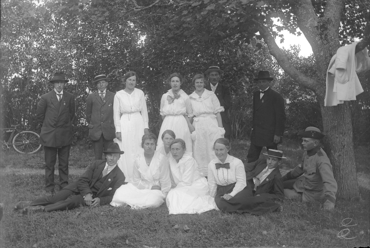 Grupp av män och kvinnor. Kvinnorna klädda i vita klänningar, männen i hatt.