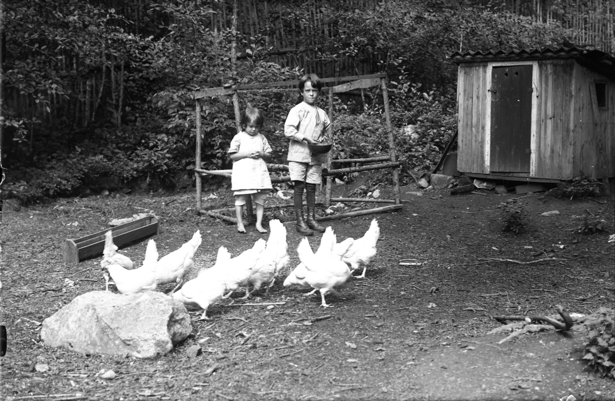 Två barn matar hönsen.