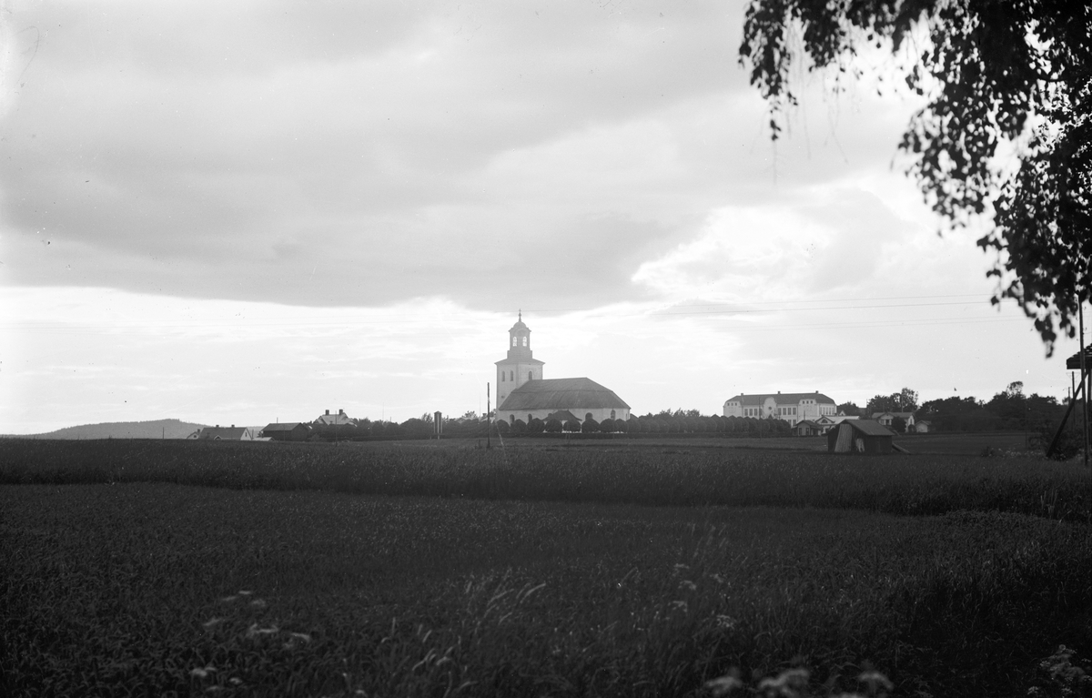 Torsåker kyrka sedd från Fors. Till höger syns taket på skyddstornet över vägen för linbanan från Walls kalkbrott. (se Torsåker 0733)