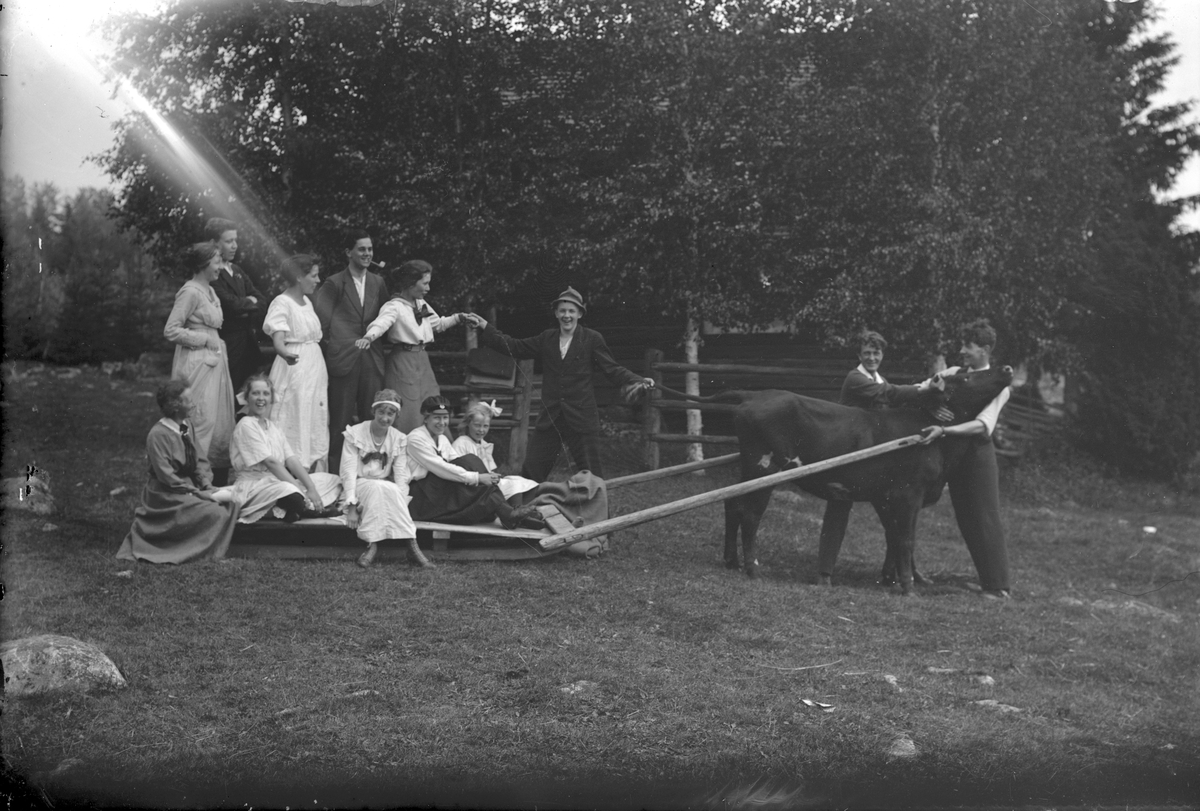 En grupp personer dras på släde av en tjur.