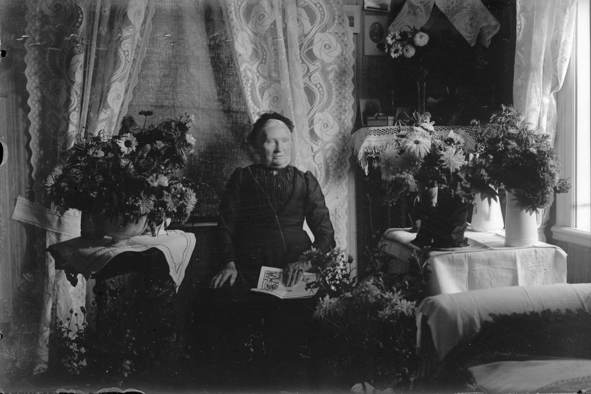 Kvinna omgiven av blomuppsättningar. Troligtvis en jubilar.