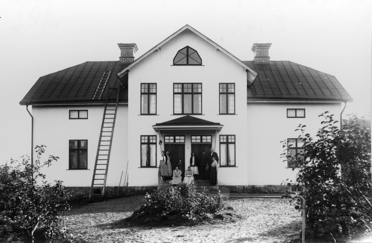 Skinnars strax efter husets rappning 1914-1915. Från vänster: okänd, Brita, Jonas, okänd, Marta, okänd, Skinnar-Pelle (Hansson), två okända.