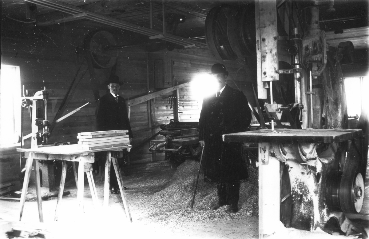 Interiör från Hedbergs snickeri i Vik. Personerna obekanta.