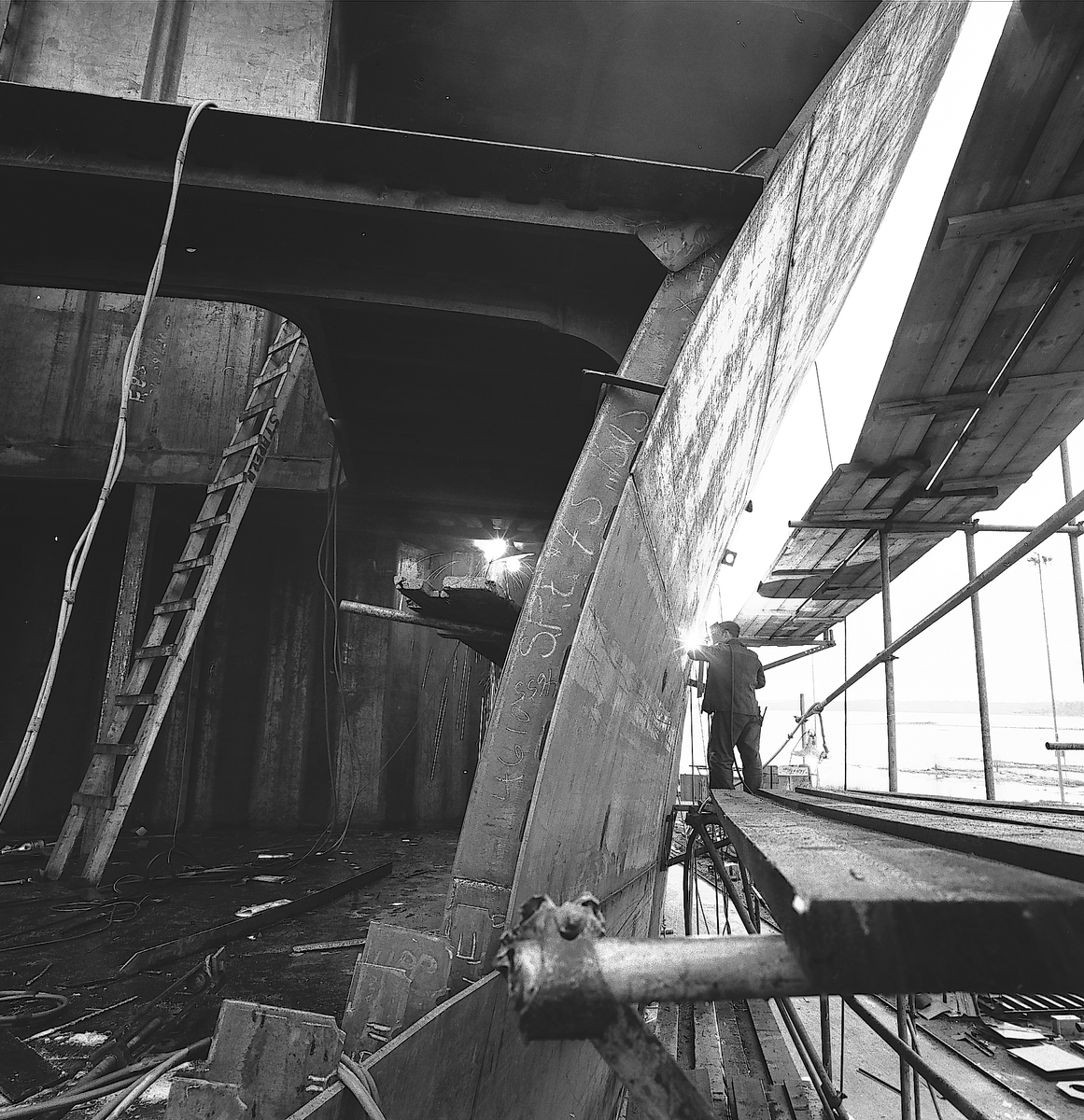Den 19 april 1961. Gävle Varv. Skrov under byggnad.